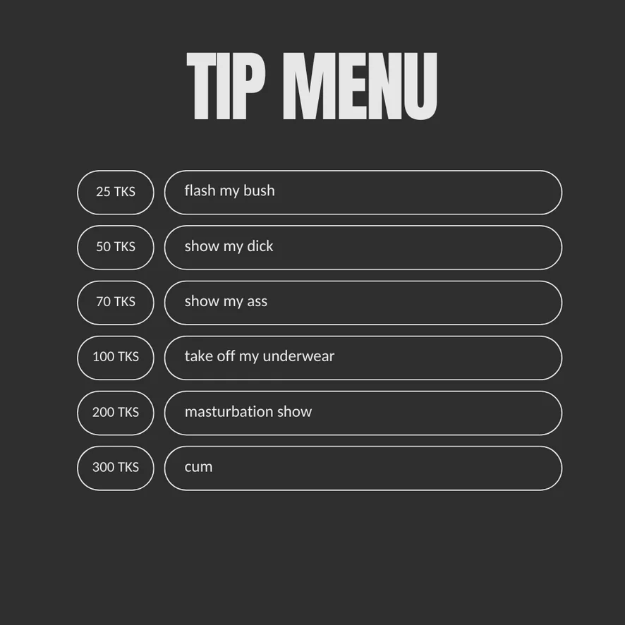 Masturbace, Ponižování, Pokyny k masturbaci, Plácání po zadku, Erotický tanec, Špinavá mluva, Footfetish, Flexing, Exhibicionismus, Honění, Olejová show, Anál, Zezadu, Dvojitý průnik, Ejakulace, Gangbang, Sexuální hračky, Kouření, Lízání kundy, Hodnocení péra, Kuřba, Anální hračky, Dildo nebo vibrátor, Deepthroat, Hračky na bradavky, Rimming, Orgasmus